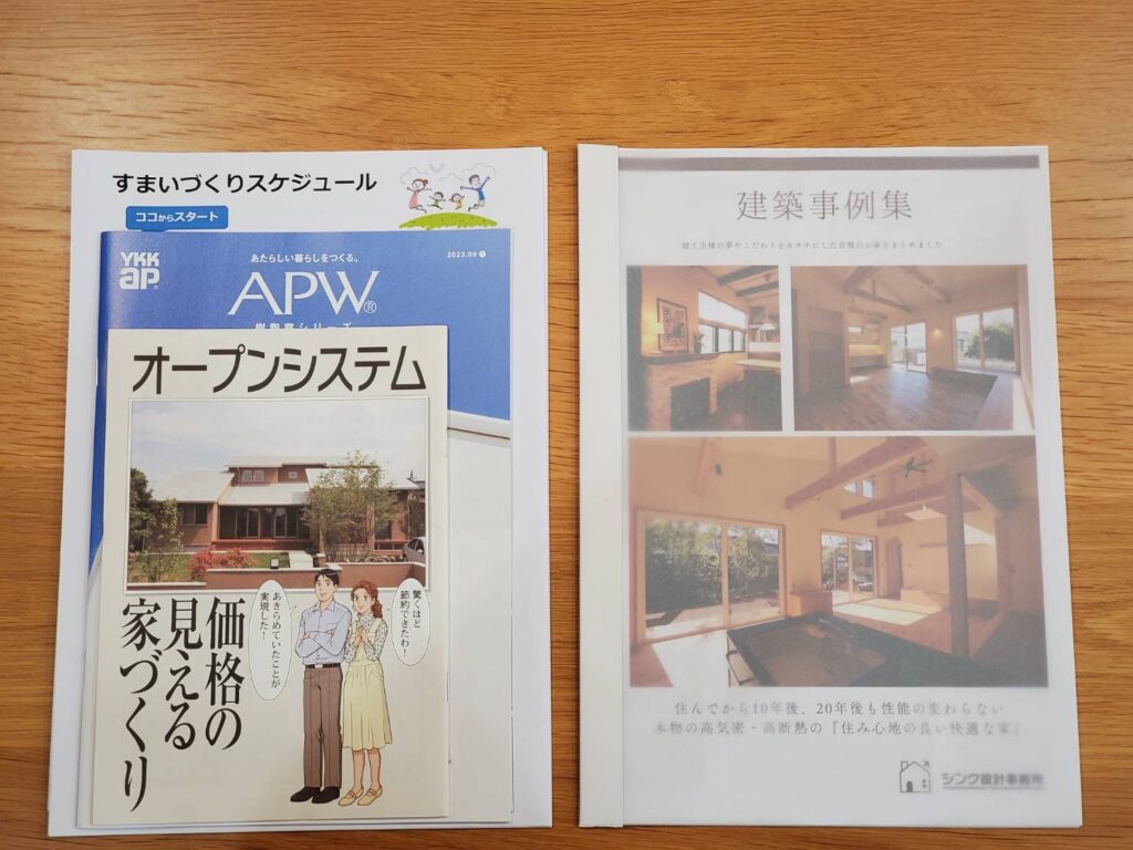 建て主様の夢やこだわりをカタチにした自慢のお家をまとめた【建築事例集】、【暖かい家づくりについて】など建築士の想いが詰まった手作り資料を送らせていただいています。