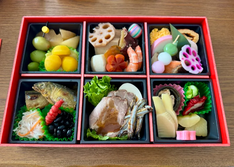 左下のお魚は仕込みに5日以上も掛けて、圧力鍋など使わないのに、頭も骨もふわふわ。(そんなことってあります??本当にすべてに感動!!)人参もお花になってる~(*^^*)彩も美しくてお味も最高のおせちでした♪