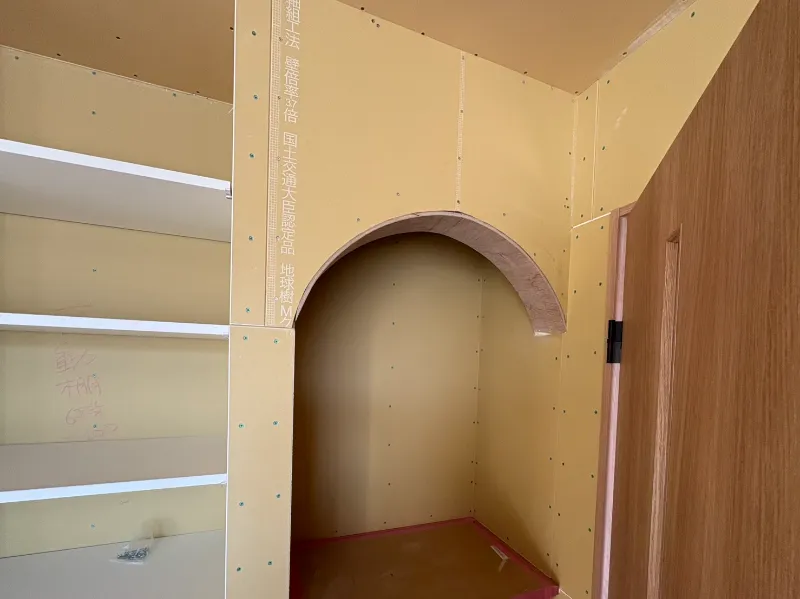 石膏ボードは曲げることができないため、曲げ合板を使います。