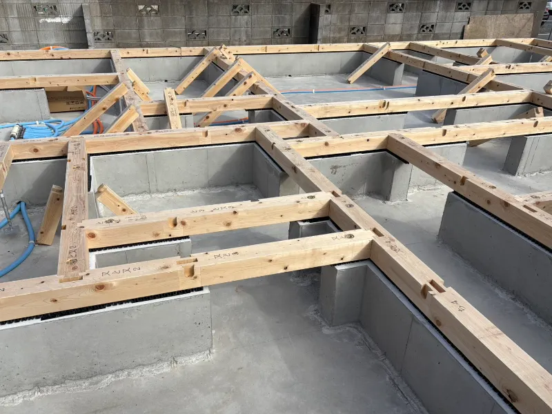 この後は大引きを並べ、床断熱、床合板を張っていく作業を行います。