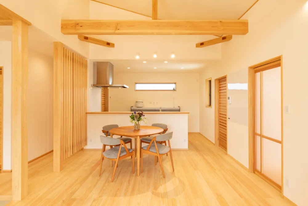 内部に入ると、桧を中心とした木材をふんだんに使い、やさしい空気と良い香りに包まれます。 勾配天井のリビングは、高さがあり開放的な空間となっています。 また木格子は、奥にあるお手洗いの目隠しと、空間のアクセントの両方の役割を担っています。 キッチンからパントリー、水まわりへと続くスムーズな動線が暮らしを豊かにします。