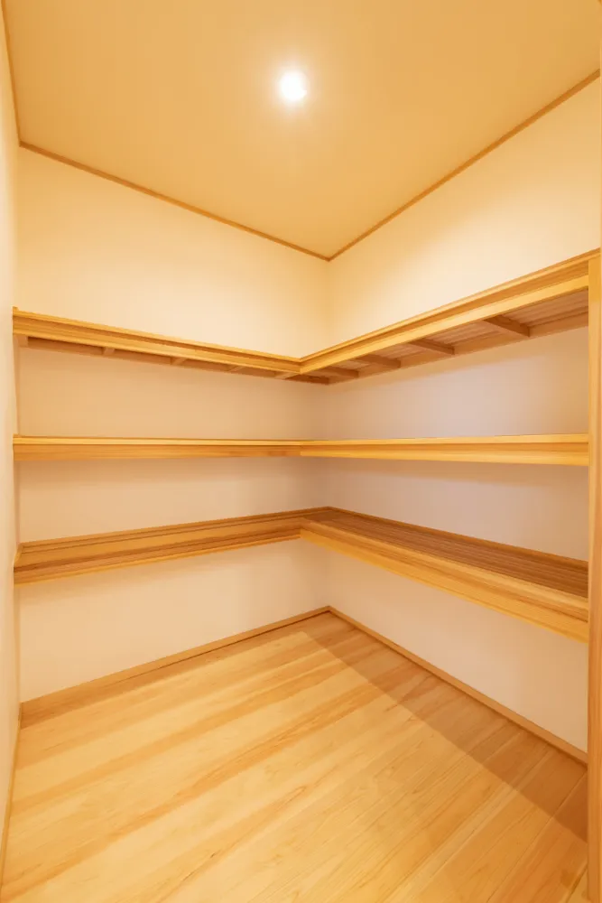 リビングの一角にある、畳コーナーは、家族の憩いの場として多目的に活躍。 障子越しにやわらかな光が差し込み、畳の香りが心を落ち着かせる空間です。 仕切られていない和室は、広がりや気配を感じ、リビングとのつながりを保ちながらも、一息つける場所となっています。