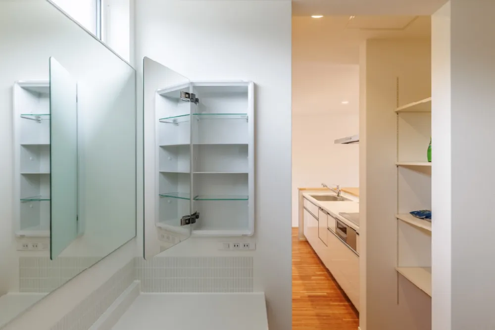 ◆しまう・隠す・動ける、家事が整う間取り キッチンからパントリー、洗面・脱衣へと直線でつながる動線は、家事を楽にするポイントの一つ。 “ゲストに見せない配置”で生活感をカバーしながら、家事動線も短くスムーズに。 空間を美しく保ちやすく、実用性にも配慮したレイアウトです。