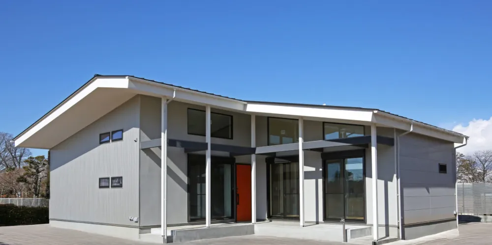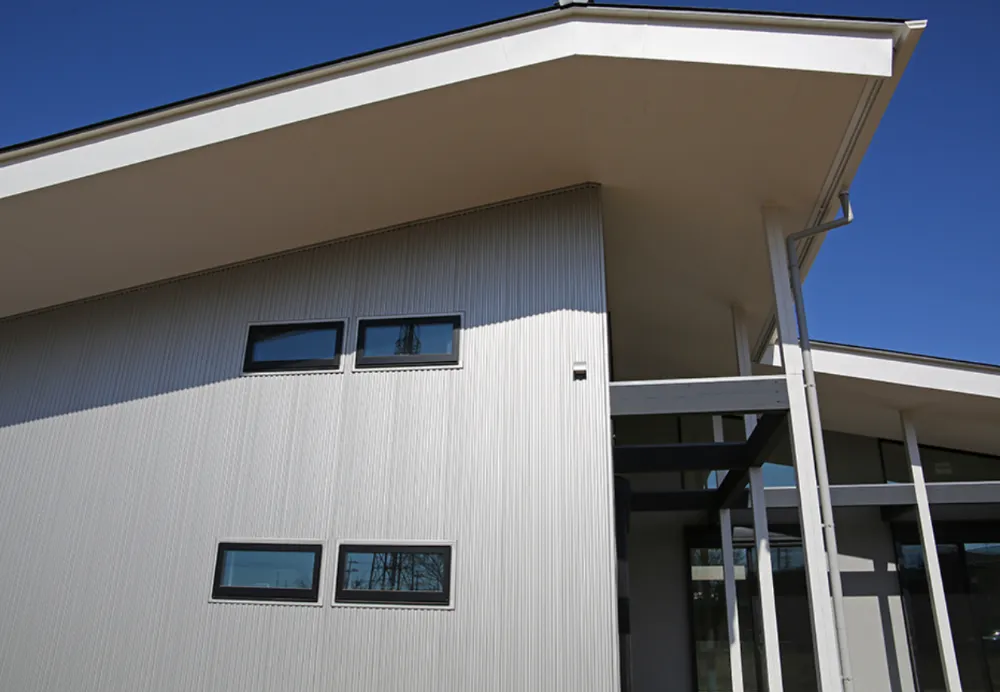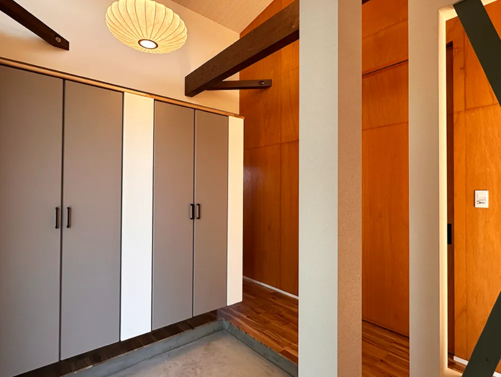 無垢材、割石、コンクリートブロック、シナベニヤ。 それぞれ異なる素材を組み合わせることで、空間にリズムと緊張感を生み出しています。 アイアン手すりのシャープなラインが全体を引き締め、ラフな素材とのコントラストが印象的なアクセントに。 外観には塗り壁とガルスパンを採用し、異素材のバランスによって、シンプルでありながら存在感のある佇まいを実現しました。 細部まで意図を持って選び抜かれた素材が、住まい全体の完成度を高めています。