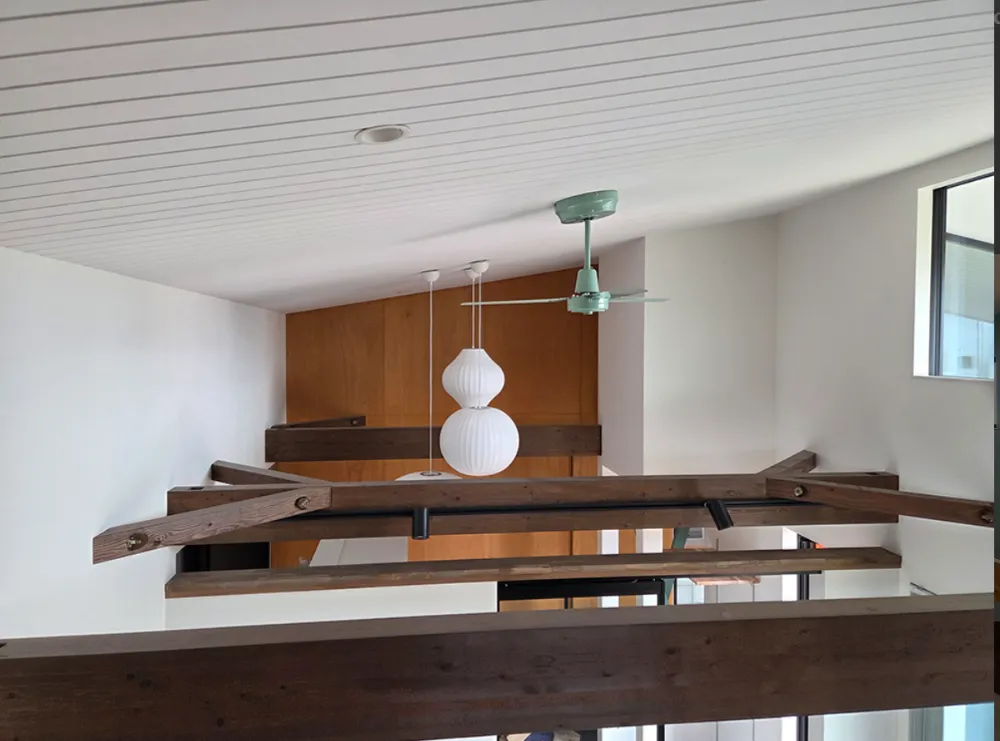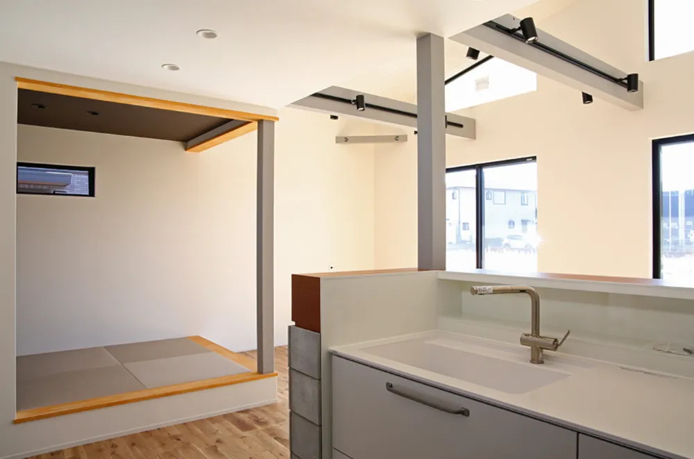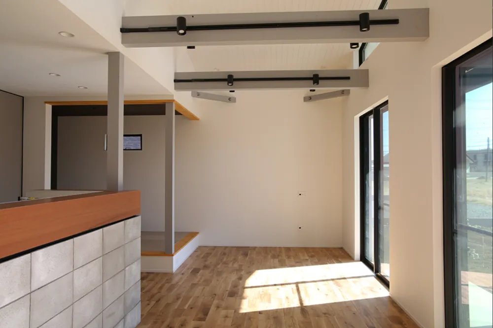 土間からセカンドリビング、そしてロフトへとつながる構成により、空間はひと続きでありながら、それぞれに役割と表情を持たせています。 視線が縦へと抜けることで、広がりだけでなく“余白”が生まれ、空間にゆとりのある印象を与えます。 大開口から取り込まれる自然光は、素材の陰影を引き立て、時間によって異なる表情を見せてくれます。