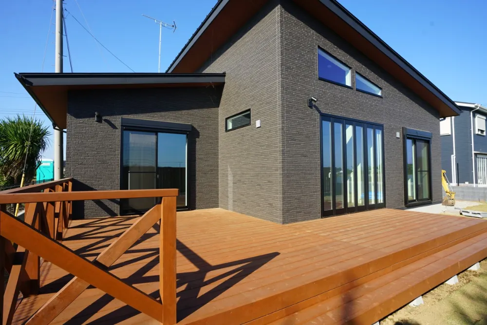 ウッドデッキとお庭が映えるモダンな平家建てとなっております。