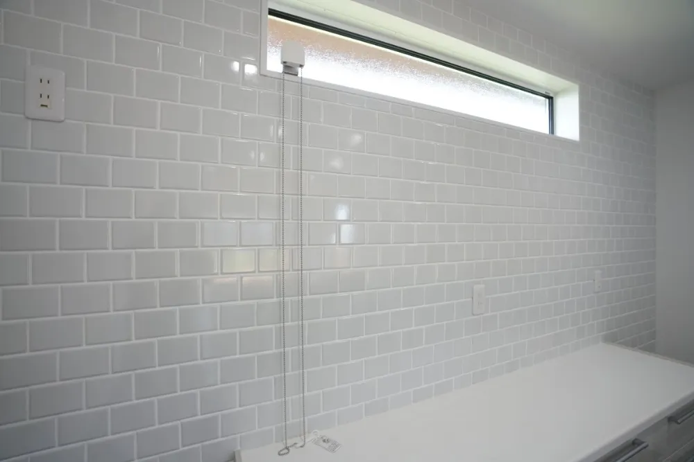 タイル貼りが印象的な、キッチン背面の便利なカップボード付き!