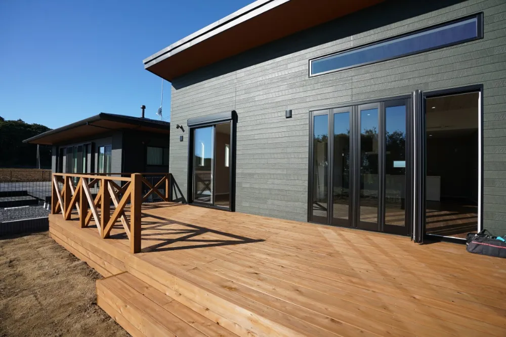 温かみのある広々としたウッドデッキ!大きなフォールディングウィンドウが室内外をシームレスにつなぎ、開放的な時間をお過ごしいただけます。